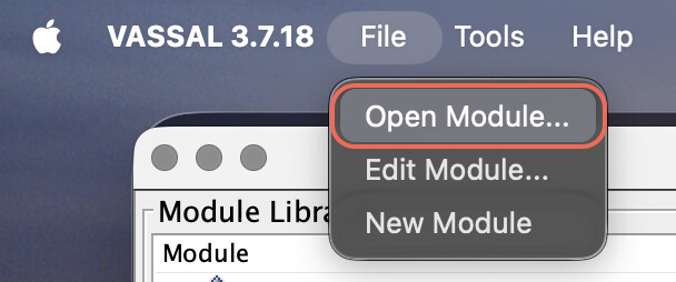 Now launch the VASSAL application. From its File menu, choose “Open Module…”