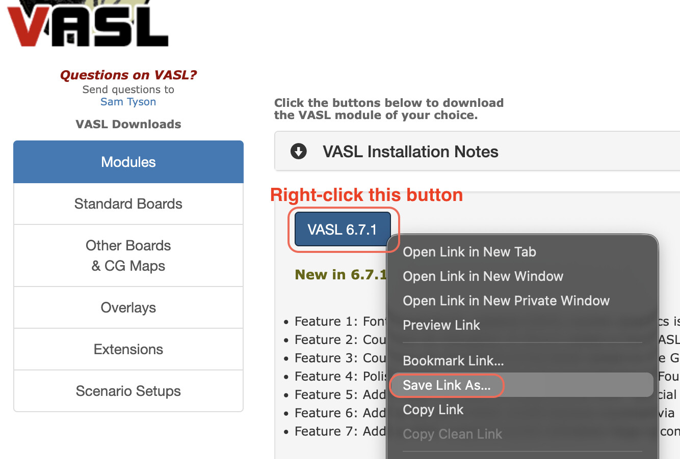 From here, you need to download the VASL module so you can open it with the VASSAL application. Navigate to the VASL website. Right-click the blue button that says VASL 6.7.1 and choose “Save link as” in your browser like so: