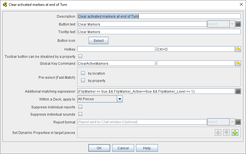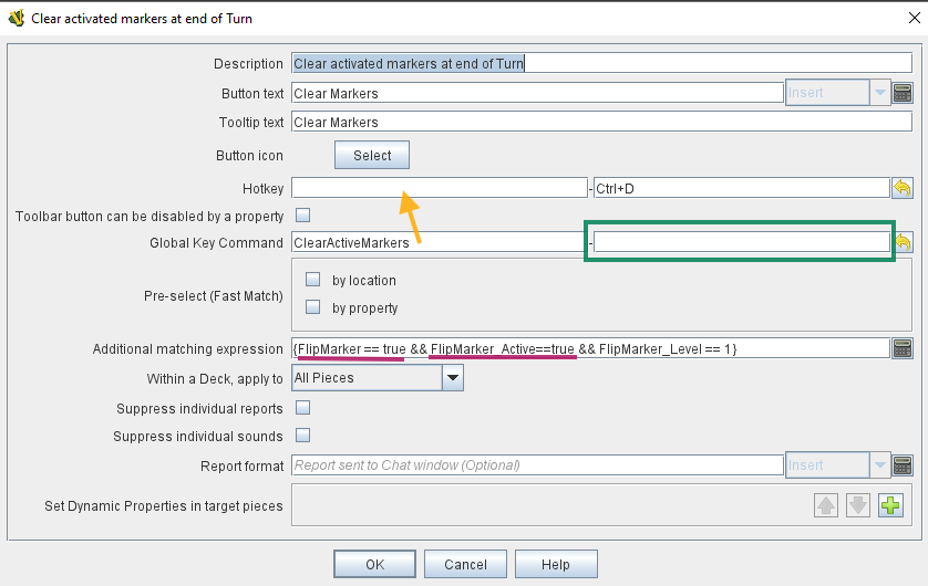 Move ClearActiveMarkers to the hotkey portion of your GKC. The Turn global hotkey you showed earlier is broadcasting ClearActiveMarkers, so you need the GKC to also act on this. In turn, what you put in the green box–this is the command the GKC is now broadcasting to all matching pieces–will depend on what you want to do. I’m a little confused if you want deletion to happen here (Ctrl+D), or the “Set to inactive” (Ctrl+Shift+Down).