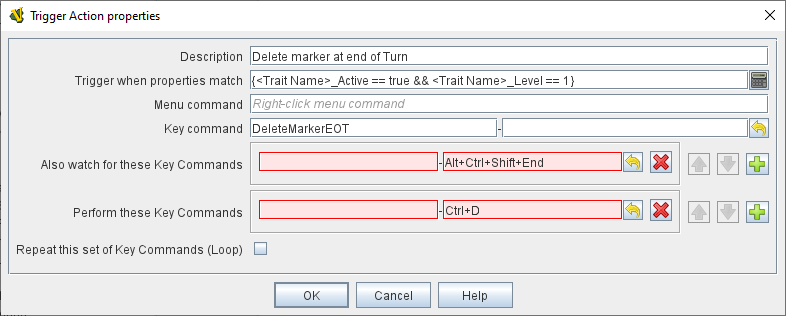 And I am trying to define the Trigger Action for the marker to be deleted if Alt+Ctrl+Shift+End gets triggered at end of Turn, however ONLY for the markers that have Layer 1 visible. Ctrl+D is the keystroke to delete the marker in-game. I am probably doing some syntax wrong or something…