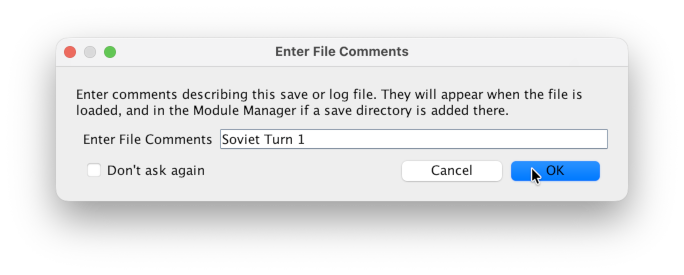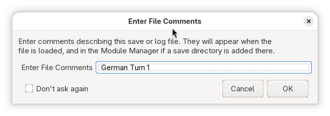 A dialog will pop-up asking for an comment on the log. You do not need to enter anything here, but it can make sense if you use Vassal method for organising log and save files.