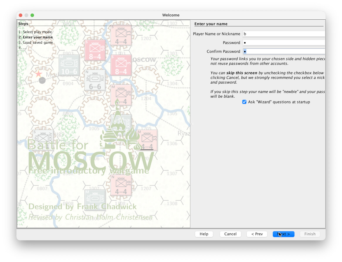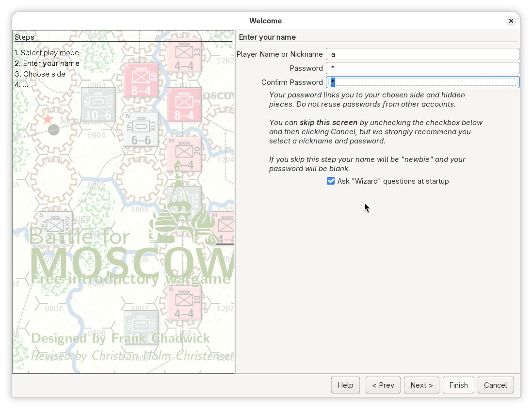 a. - Passowrd: The password to protect the logs and moved by player A. This should not be left empty, and must be unique between the players, as this is what uniquely identifies a player. Here, we will choose the password