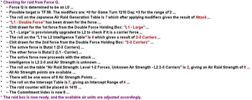 At first, I added a command that conducted an air raid to the forces known to have carriers (a so-called “Butai’). This worked OK with a noticeable degradation in performance, but not too much. On playing the game, I realised that it would be beneficial to extend this to the other category of forces, namely those that may or may not have carriers. Unfortunately, this involves situations where a single force might turn out to be two forces, and a lot of chit-pulling, and die-rolling is needed to resolve this.