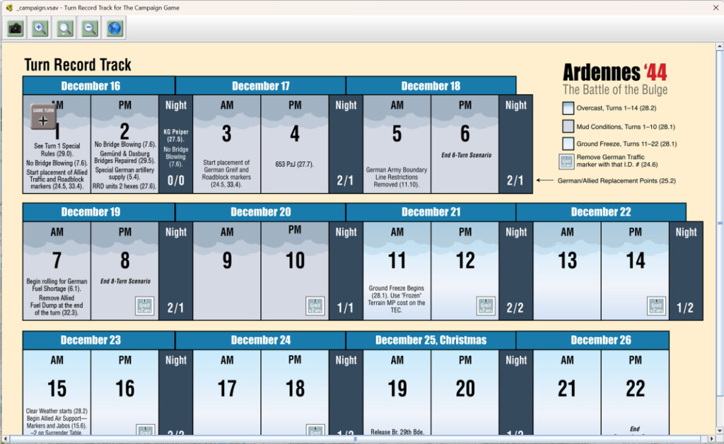 I’ve just found another issue with this module. When using the Campaign Game or Pattons Counterattack setups, I can’t find where reinforcements appear in the menu. In the 3rd edition they appeared in the time track in the turn they are meant to arrive.
