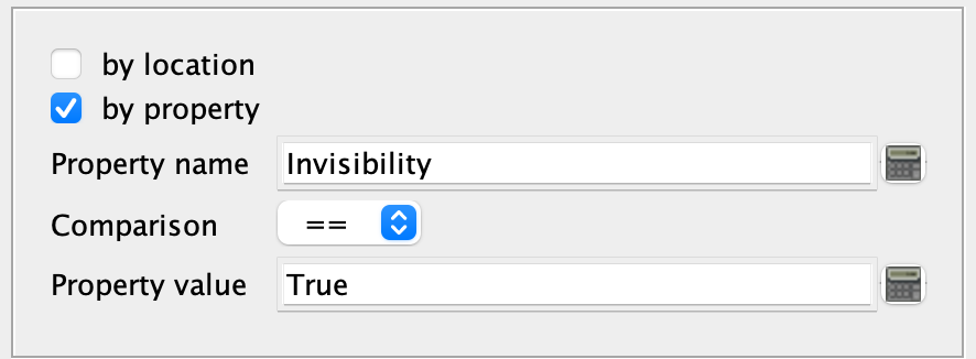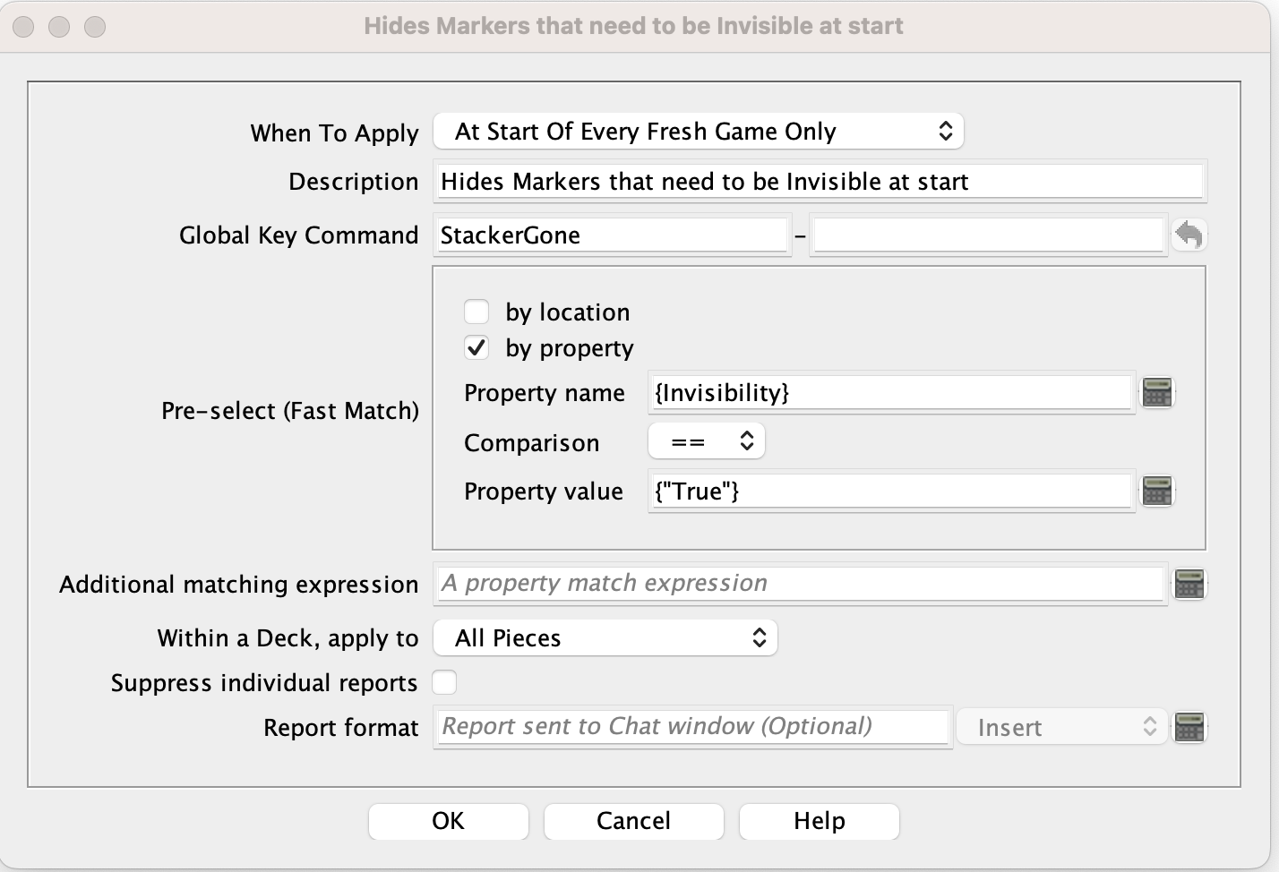 One issue is that {Invisibility} means “the property name that is whatever the value of Invisibility is”. That’s a very useful technique called indirection but not what you want here. What you have coded is “find any property with a blank (null) name that equals true”. I’m guessing by a quirk of vassal that finds every piece, so it works.