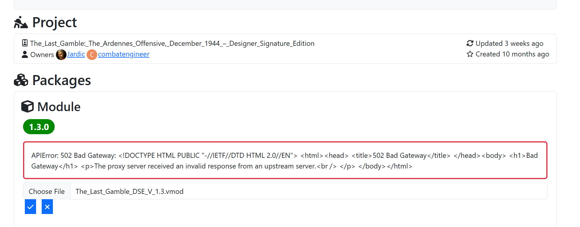 Still no luck uploading this module. Blows up at the very end of the upload with the same error message.