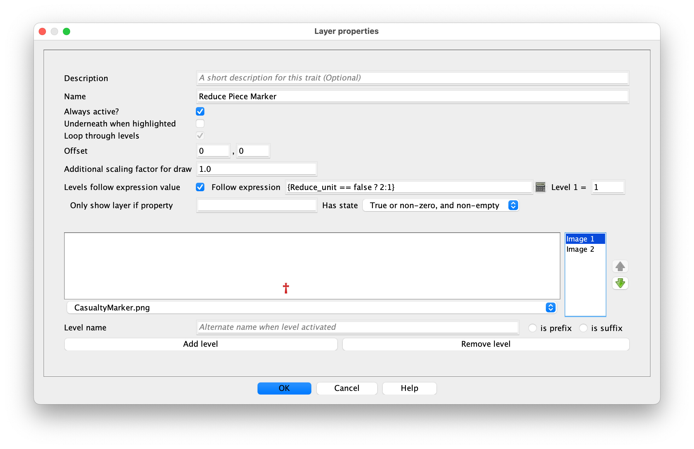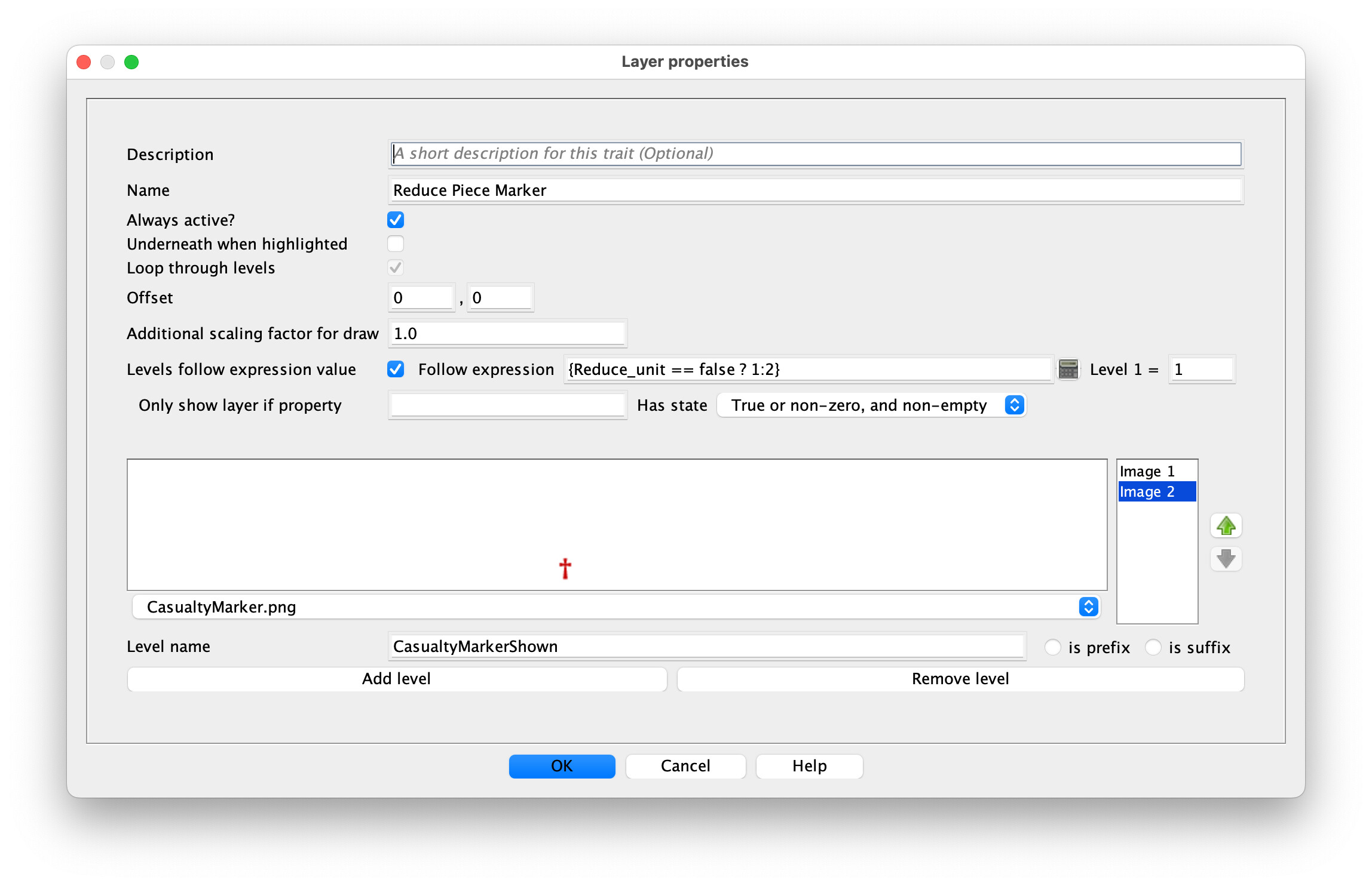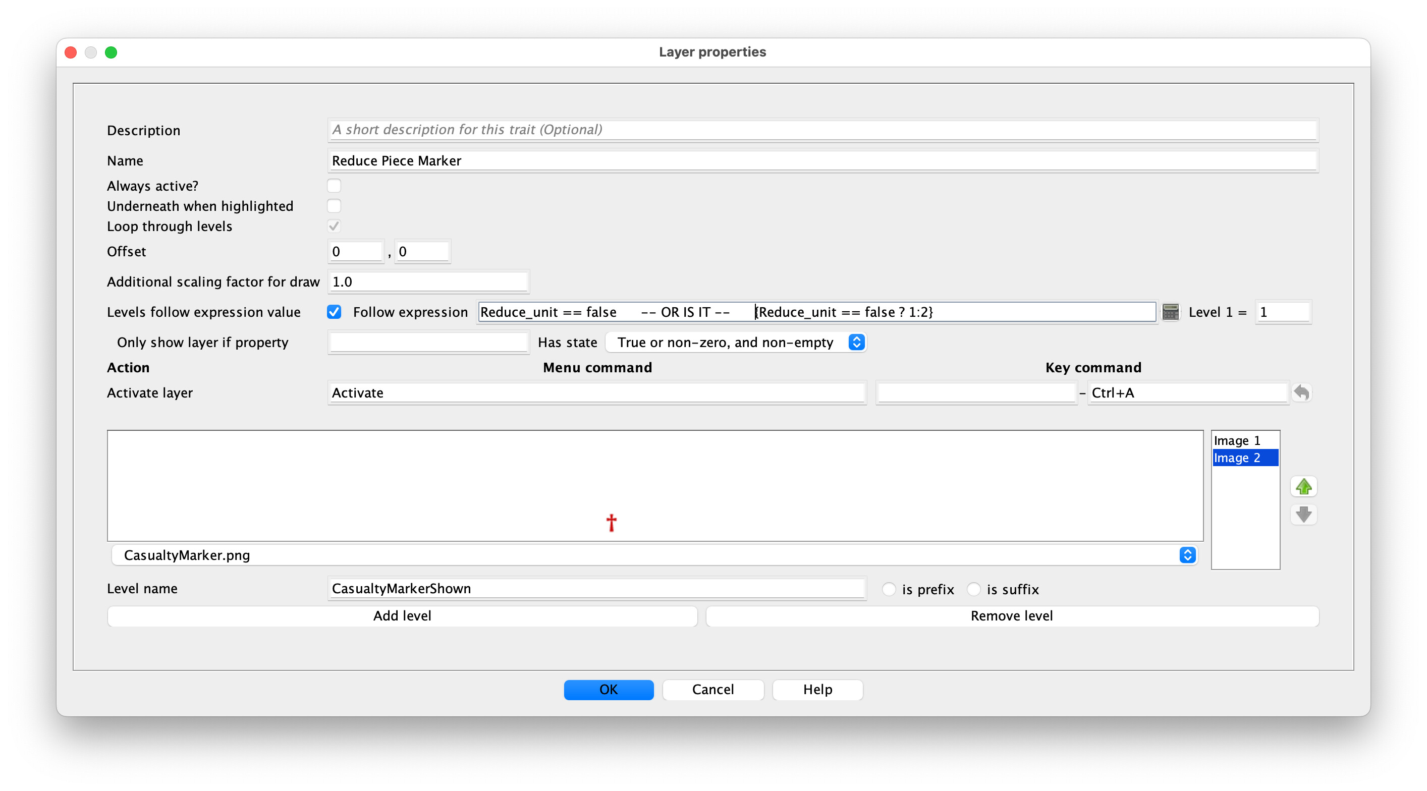 Edit: If you’re going to use the Activate Layer command to activate it, it would be much simpler to delete the first layer and the Levels follow expression value completely (and you could then get rid of the Dynamic Property Reduce_unit, also); you could directly check {GetProperty("Reduce Piece Marker_Active")} if you need to know if the layer is active from somewhere else. (You only need the “GetProperty()” function because your layer name has spaces, FYI.)
