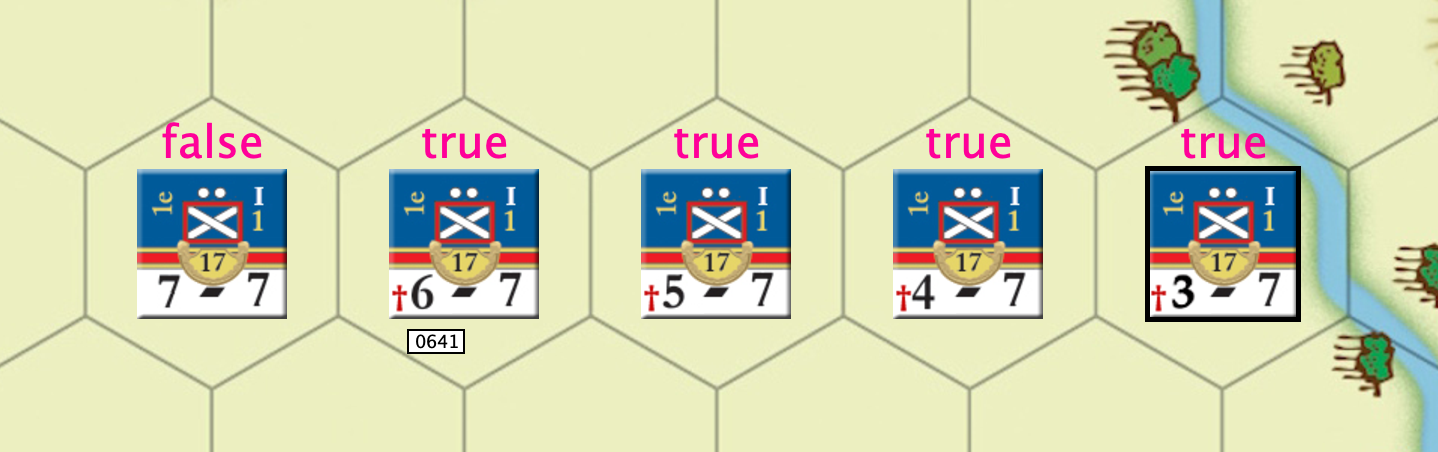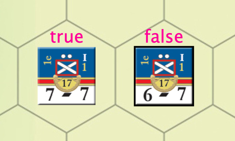 I have a situation where I need to change the visibility of a layer based on an expression. And I can’t quite seem to make it work. The idea is that is in its initial state. A unit is not reduced. When I reduce it, I have one layer that is changing correctly, showing the number of points in the unit so that it decrements from 7 to 6 to 5 and so on which works. I also have a dynamic property that changes from false to true when the unit is decremented.