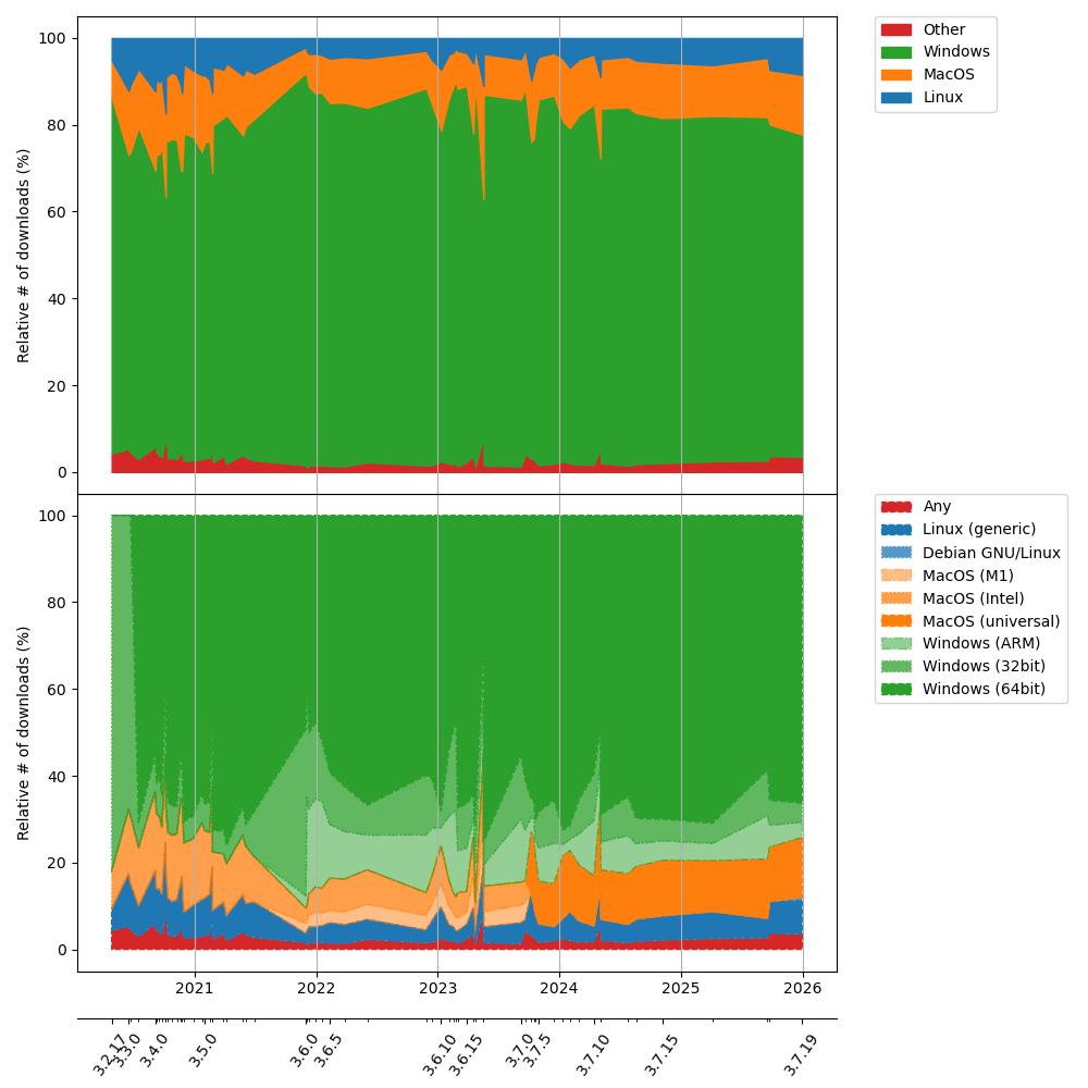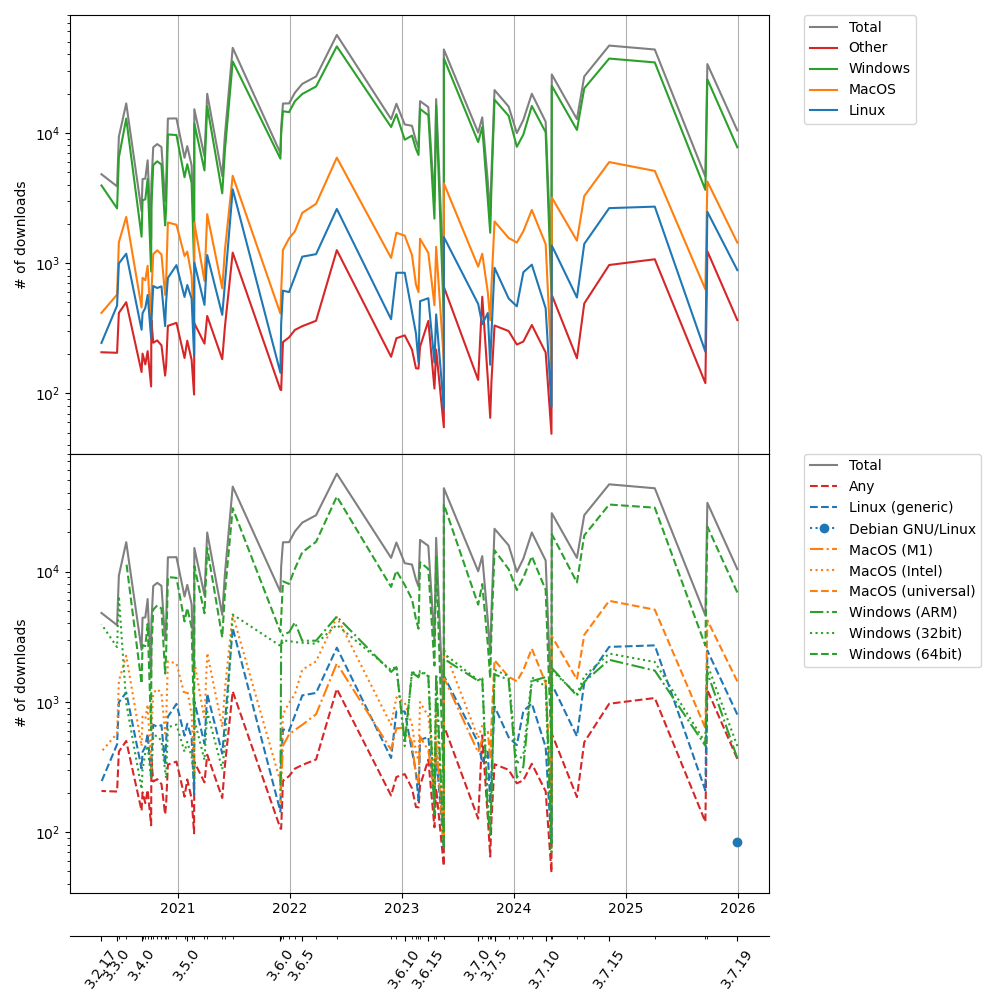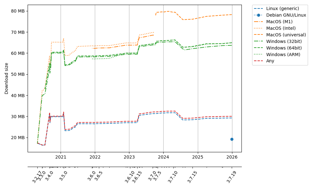 The sizes of the downloads are rather stable over time, except a sharp increase in the 3.6.16 release and an almost corresponding decrease in release 3.7.13. At release 3.4.0, the packages increased dramatically in size and has remained somewhat stable ever since.